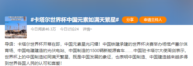 11月20日,2022年卡塔爾世界杯正式開幕。開幕式當天,中國外交部發言人華春瑩在推特上連發8條推文,以圖文并茂的方式介紹世界杯“隨處可見的中國元素”。這也讓“卡塔爾世界杯中國元素如滿天繁星”的話題登上熱搜。