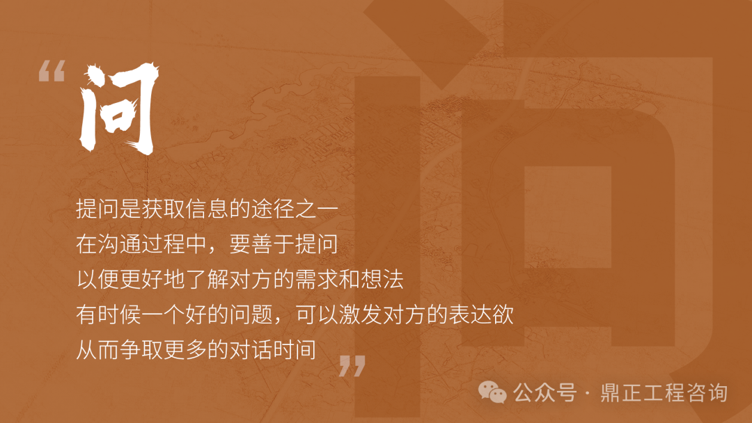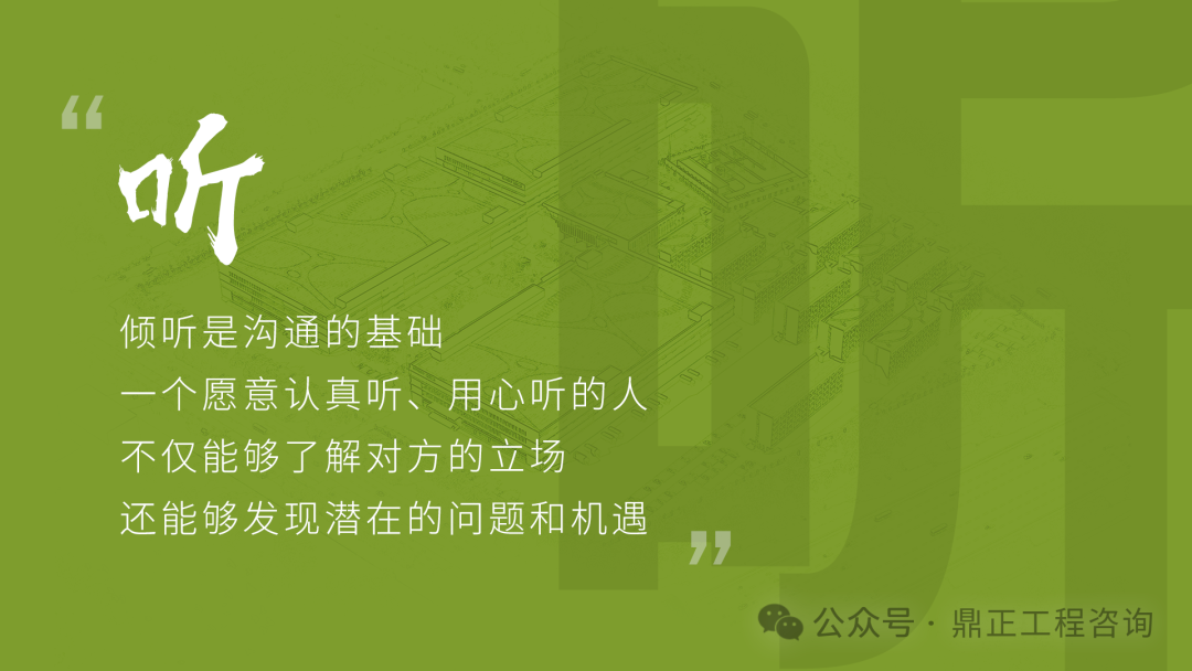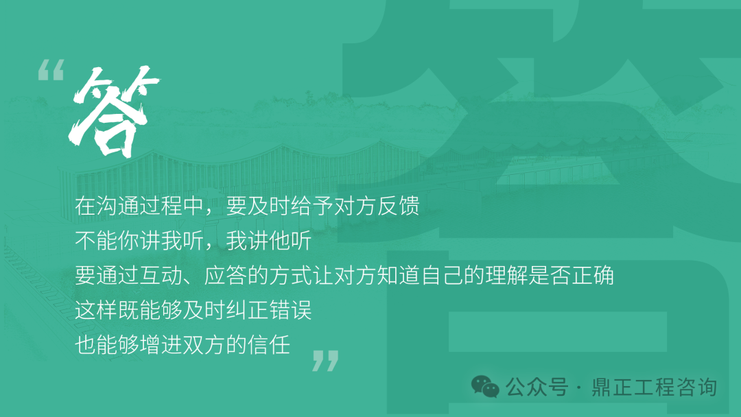 交流要看對象,不能對牛彈琴。與農(nóng)民工交流要用農(nóng)民工聽得懂的語言;與同行或其他咨詢機(jī)構(gòu)交流要用專業(yè)語言;與直接上級交流要及時(shí)反饋并提出合理建議;與客戶交流,要從客戶的視角出發(fā),為其提供最優(yōu)解決方案。