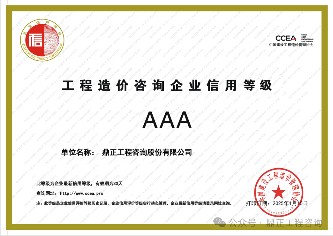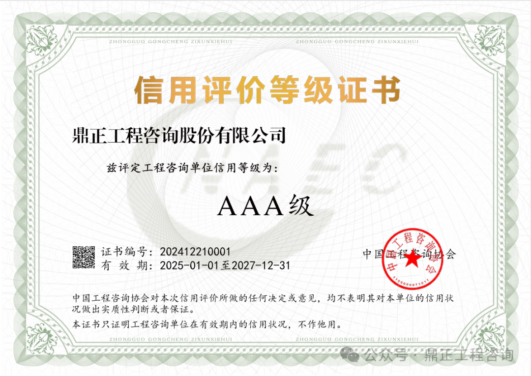 近日,中國工程咨詢協(xié)會發(fā)布了2024年度工程咨詢單位信用評價公告,鼎正憑借優(yōu)異的誠信建設(shè)和信用管理能力,榮獲“AAA級信用等級”評價。