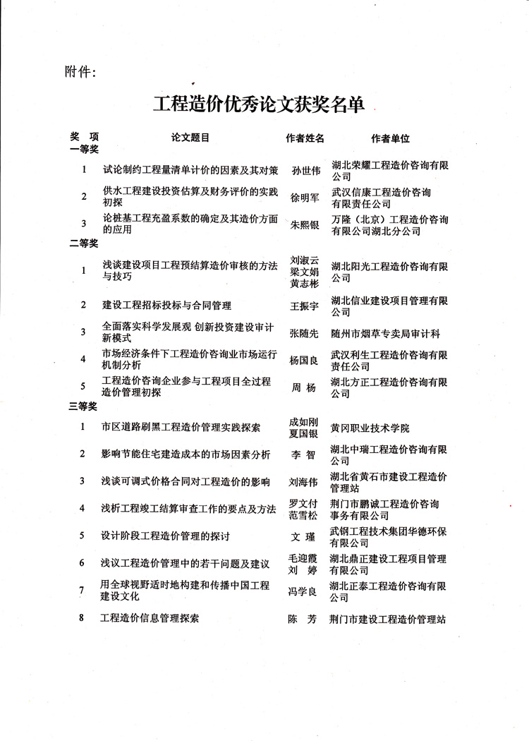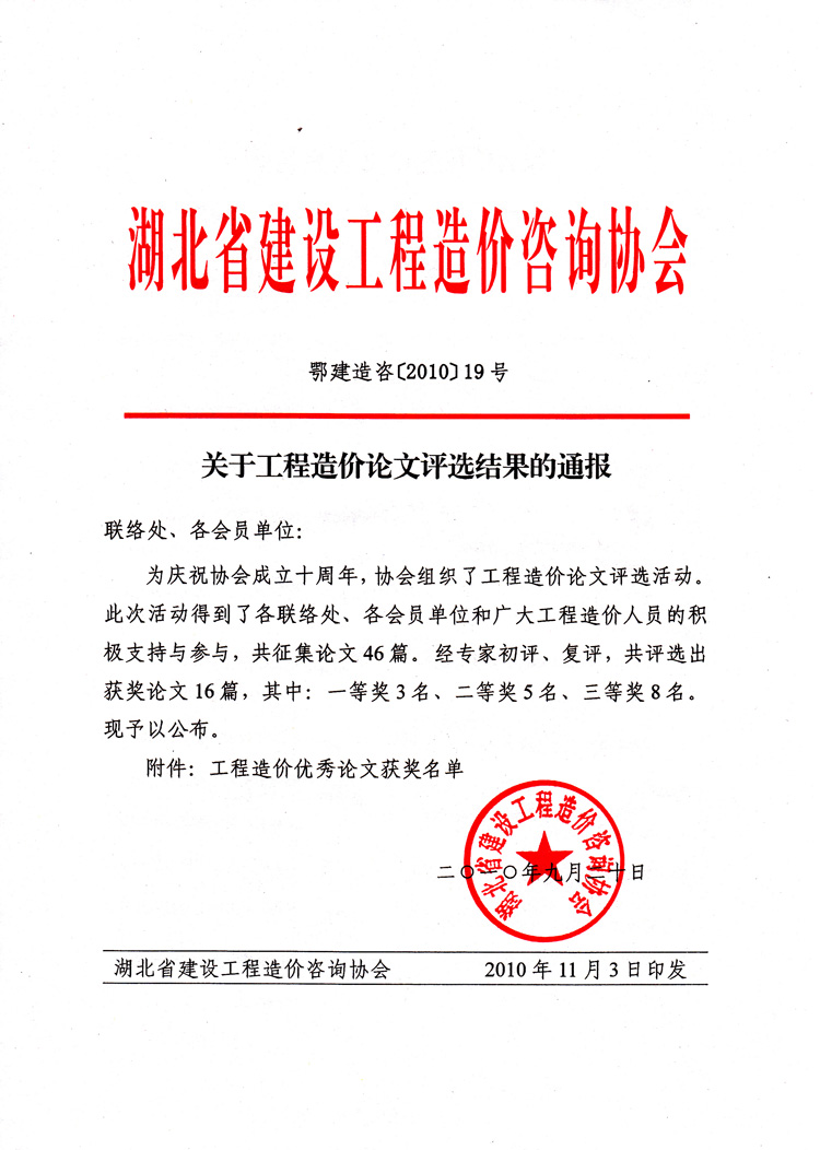 熱烈祝賀我公司在湖北省建設工程造價咨詢協會十周年之際舉辦的“工程造價論文評選活動”中獲得三等獎。
