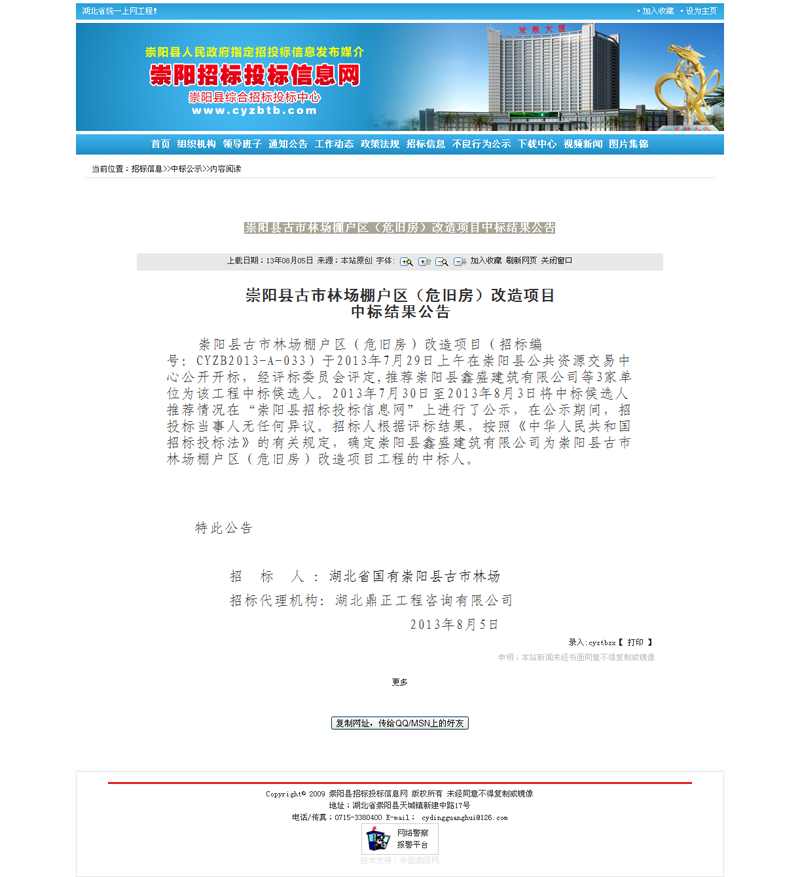 崇陽縣古市林場棚戶區(危舊房)改造項目中標結果公告