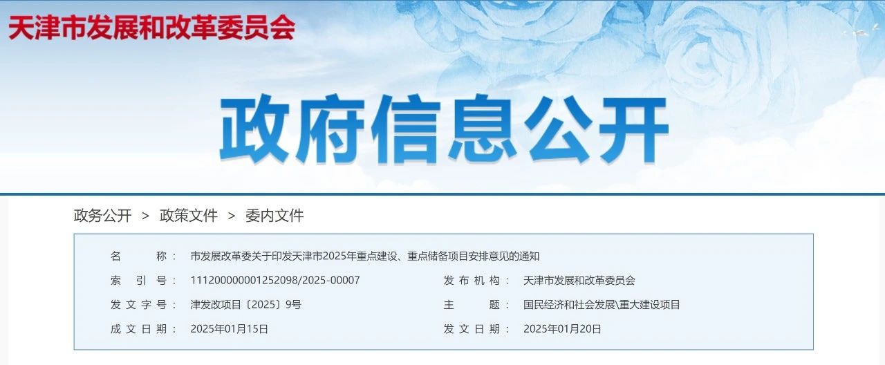 天津市發(fā)展改革委發(fā)布2025年重點(diǎn)建設(shè)、重點(diǎn)儲(chǔ)備項(xiàng)目安排意見,共計(jì)1129個(gè)項(xiàng)目、總投資2.02萬(wàn)億元。其中,包括重點(diǎn)建設(shè)項(xiàng)目854個(gè),總投資1.52萬(wàn)億元,年度計(jì)劃投資2209.07億元,均為在建續(xù)建或即將開工項(xiàng)目;重點(diǎn)儲(chǔ)備項(xiàng)目275個(gè),總投資4992.26億元。